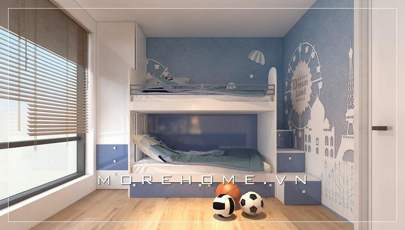 Nội thất phòng ngủ bé trai màu xanh đặc biệt ấn tượng khi kết hợp với tranh dán tường cao cấp, tạo nên một cảnh đẹp mắt và hài hòa.