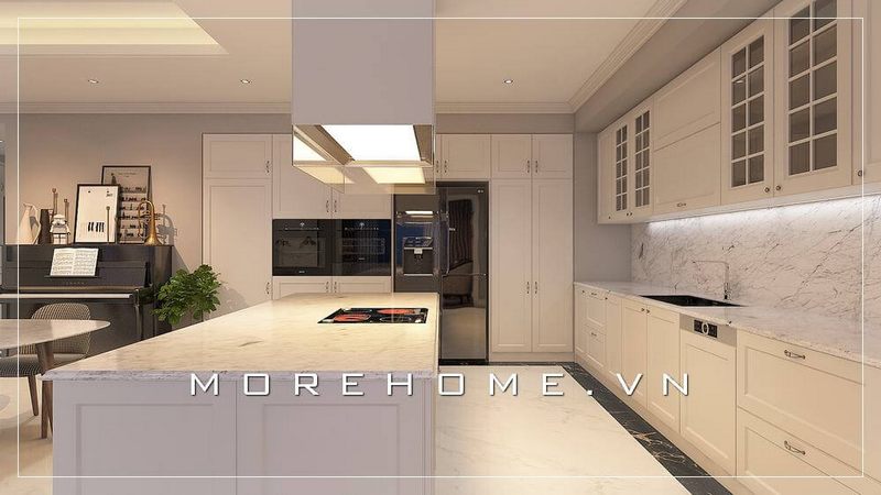 Nội thất phòng bếp tân cổ điển tone màu trắng sang trọng được thiết kế cho nhà chung cư.
