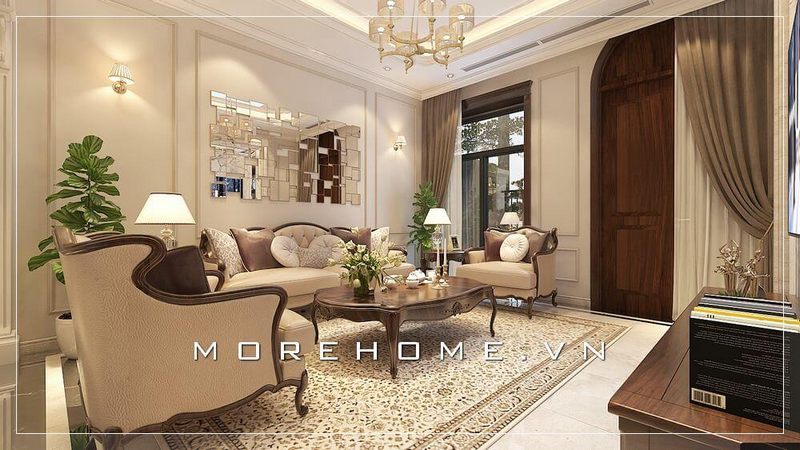 Thiết kế nội thất phòng khách với kiểu dáng cổ điển đẹp bằng gỗ óc chó tân cho các căn biệt thự, nhà phố.